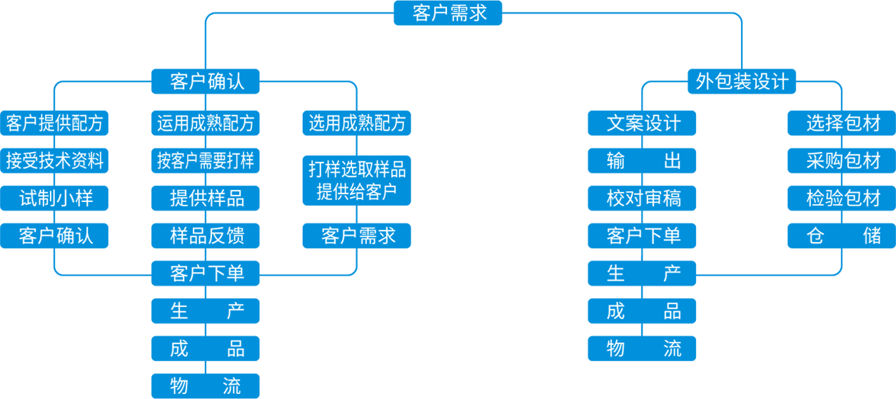 客户自带品牌、包装材料和产品配方,我方提供原料及产品加工。